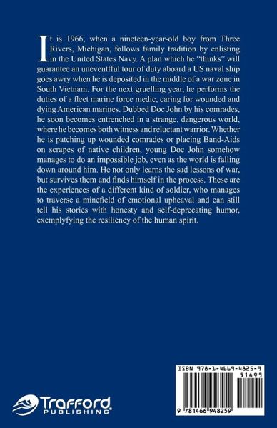 It is 1966, when a nineteen-year-old boy from Three Rivers, Michigan, follows family tradition by enlisting in the United States Navy. A plan which he "thinks" will guarantee an uneventfful tour of duty aboard a US naval ship goes awry when he is deposited in the middle of a war zone in South Vietnam. For the next gruelling year, he performs the duties of a fleet marine force medic, caring for wounded and dying American marines. Dubbed Doc John by his comrades, he soon becomes entrenched in a strange, dangerous world, where he becomes both witness and reluctant warrior. Whether he is patching up wounded comrades or placing Band-Aids on scrapes of native children, young Doc John somehow manages to do an impossible job, even as the world is falling down around him. He not only learns the sad lessons of war, but survives them and finds himself in the process. These are the experiences of a different kind of soldier, who manages to traverse a minefield of emotional upheaval and can still tell his stories with honesty and self-deprecating humor, exemplyfying the resiliency of the human spirit.