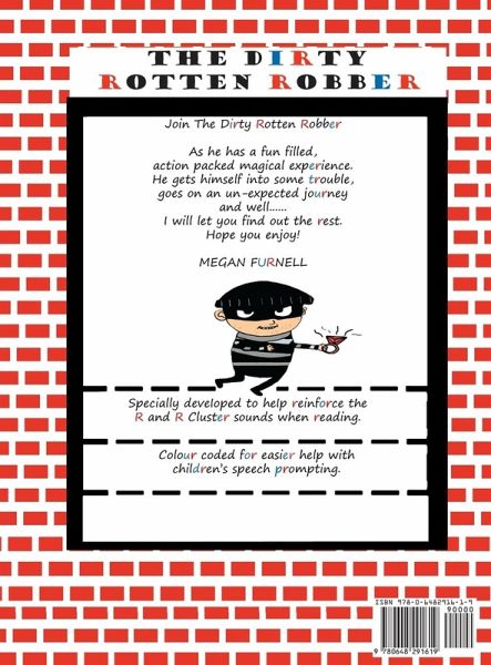 Originally written and illustrated by Megan Furnell Certified Education Support Officer for her son who suffers Verbal Dyspraxia. She decided that others might also benefit from the book as she loves helping and working with special needs children. It has also been written in a way that it is an enjoyable funny book for all children that do not even need special help to read.Join The Dirty Rotten Robber as he has a fun-filled, action packed, magical experience. He gets himself into some trouble, goes on an unexpected journey, and well . . . I will let you find out the rest. Hope you enjoy! by Megan Furnell . This is specially developed to help reinforce the R and R cluster sounds when reading. This is color-coded for easier help with children's speech prompting.