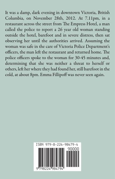It was a damp, dark evening in downtown Victoria, British Columbia, on November 28th, 2012. At 7.11pm, in a restaurant across the street from The Empress Hotel, a man called the police to report a 26 year old woman standing outside the hotel, barefoot and in severe distress, then sat observing her until the authorities arrived. Assuming the woman was safe in the care of Victoria Police Department's officers, the man left the restaurant and returned home. The police officers spoke to the woman for 30-45 minutes and, determining that she was neither a threat to herself or others, left her where they had found her, still barefoot in the cold, at about 8pm. Emma Fillipoff was never seen again.