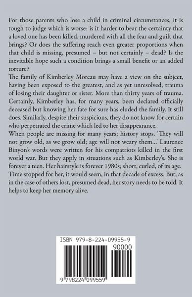 For those parents who lose a child in criminal circumstances, it is tough to judge which is worse: is it harder to bear the certainty that a loved one has been killed, murdered with all the fear and guilt that brings? Or does the suffering reach even greater proportions when that child is missing, presumed - but not certainly - dead? Is the inevitable hope such a condition brings a small benefit or an added torture? The family of Kimberley Moreau may have a view on the subject, having been exposed to the greatest, and as yet unresolved, trauma of losing their daughter or sister. More than thirty years of trauma. Certainly, Kimberley has, for many years, been declared officially deceased but knowing her fate for sure has eluded the family. It still does. Similarly, despite their suspicions, they do not know for certain who perpetrated the crime which led to her disappearance. When people are missing for many years; history stops. 'They will not grow old, as we grow old; age will not weary them...' Laurence Binyon's words were written for his compatriots killed in the first world war. But they apply in situations such as Kimberley's. She is forever a teen. Her hairstyle is forever 1980s; short, curled, of its age. Time stopped for her, it would seem, in that decade of excess. But, as in the case of others lost, presumed dead, her story needs to be told. It helps to keep her memory alive.