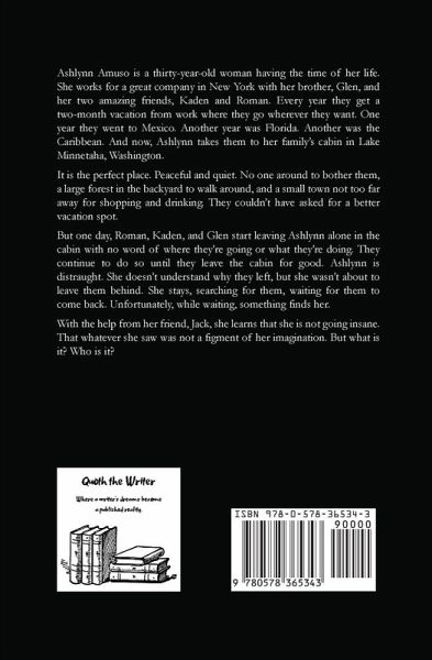 Ashlynn Amuso is a thirty-year-old woman having the time of her life. She works for a great company in New York with her brother, Glen, and her two amazing friends, Kaden and Roman. Every year they get a two-month vacation from work where they go wherever they want. One year they went to Mexico. Another year was Florida. Another was the Caribbean. And now, Ashlynn takes them to her family's cabin in Lake Minnetaha, Washington. It is the perfect place. Peaceful and quiet. No one around to bother them, a large forest in the backyard to walk around, and a small town not too far away for shopping and drinking. They couldn't have asked for a better vacation spot. But one day, Roman, Kaden, and Glen start leaving Ashlynn alone in the cabin with no word of where they're going or what they're doing. They continue to do so until they leave the cabin for good. Ashlynn is distraught. She doesn't understand why they left, but she wasn't about to leave them behind. She stays, searching for them, waiting for them to come back. Unfortunately, while waiting, something finds her. With the help from her friend, Jack, she learns that she is not going insane. That whatever she saw was not a figment of her imagination. But what is it? Who is it?