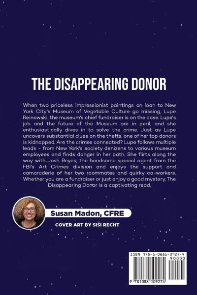 When two priceless impressionist paintings on loan to New York City's Museum of Vegetable Culture go missing, Lupe Reinowski, the museum's chief fundraiser is on the case. Lupe's job and the future of the Museum are in peril, and she enthusiastically dives in to solve the crime. Just as Lupe uncovers substantial clues on the thefts, one of her top donors is kidnapped. Are the crimes connected? Lupe follows multiple leads - from New York's society denizens to various museum employees and finds danger in her path. She flirts along the way with Josh Reyes, the handsome special agent from the FBI's Art Crimes division and enjoys the support and camaraderie of her two roommates and quirky co-workers. Whether you are a fundraiser or just enjoy a good mystery, The Disappearing Donor is a captivating read.