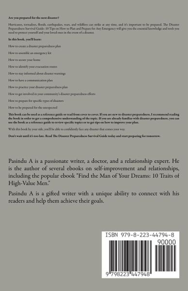 Are you prepared for the next disaster? Hurricanes, tornadoes, floods, earthquakes, wars, and wildfires can strike at any time, and it's important to be prepared. The Disaster Preparedness Survival Guide: 10 Tips on How to Plan and Prepare for Any Emergency will give you the essential knowledge and tools you need to protect yourself and your loved ones in the event of a disaster. In this book, you'll learn: How to create a disaster preparedness plan How to assemble an emergency kit How to secure your home How to identify your evacuation routes How to stay informed about disaster warnings How to have a communication plan How to practice your disaster preparedness plan How to get involved in your community's disaster preparedness efforts How to prepare for specific types of disasters How to be prepared for the unexpected This book can be used as a reference guide or read from cover to cover. If you are new to disaster preparedness, I recommend reading the book in order to get a comprehensive understanding of the topic. If you are already familiar with disaster preparedness, you can use the book as a reference guide to review specific topics or to get tips on how to improve your plan. With this book by your side, you'll be able to confidently face any disaster that comes your way. Don't wait until it's too late. Read The Disaster Preparedness Survival Guide today and start preparing for tomorrow.