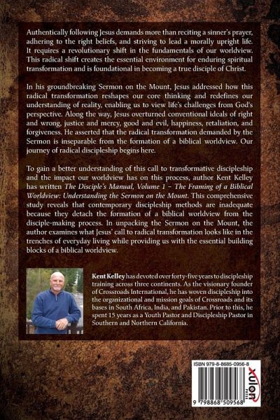 Authentically following Jesus demands more than reciting a sinner's prayer, adhering to the right beliefs, and striving to lead a morally upright life. It requires a revolutionary shift in the fundamentals of our worldview. This radical shift creates the essential environment for enduring spiritual transformation and is foundational in becoming a true disciple of Christ. In his groundbreaking Sermon on the Mount, Jesus addressed how this radical transformation reshapes our core thinking and redefines our understanding of reality, enabling us to view life's challenges from God's perspective. Along the way, Jesus overturned conventional ideals of right and wrong, justice and mercy, good and evil, happiness, retaliation, and forgiveness. He asserted that the radical transformation demanded by the Sermon is inseparable from the formation of a biblical worldview. Our journey of radical discipleship begins here. To gain a better understanding of this call to transformative discipleship and the impact our worldview has on this process, author Kent Kelley has written The Disciple's Manual, Volume 1 - The Framing of a Biblical Worldview: Understanding the Sermon on the Mount. This comprehensive study reveals that contemporary discipleship methods are inadequate because they detach the formation of a biblical worldview from the disciple-making process. In unpacking the Sermon on the Mount, the author examines what Jesus' call to radical transformation looks like in the trenches of everyday living while providing us with the essential building blocks of a biblical worldview. Kent Kelley has devoted over forty-five years to discipleship training across three continents. As the visionary founder of Crossroads International, he has woven discipleship into the organizational and mission goals of Crossroads and its bases in South Africa, India, and Pakistan. Prior to this, he spent 15 years as a Youth Pastor and Discipleship Pastor in Southern and Northern California.