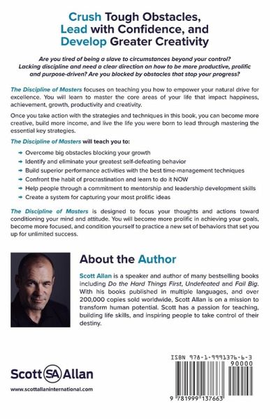 Crush Tough Obstacles, Lead with Confidence, and Develop Greater Creativity Are you tired of being a slave to circumstances beyond your control? Lacking discipline and need a clear direction on how to be more productive, prolific and purpose-driven? Are you blocked by obstacles that stop your progress? The Discipline of Masters focuses on teaching you how to empower your natural drive for excellence. You will learn to master the core areas of your life that impact happiness, achievement, growth, productivity and creativity. Once you take action with the strategies and techniques in this book, you can become more creative, build more income, and live the life you were born to lead through mastering the essential key strategies. The Discipline of Masters will teach you to: Overcome big obstacles blocking your growth Identify and eliminate your greatest self-defeating behavior Build superior performance activities with the best time-management techniques Confront the habit of procrastination and learn to do it NOW Help people through a commitment to mentorship and leadership development skills Create a system for capturing your most prolific ideas. The Discipline of Masters is designed to focus your thoughts and actions toward conditioning your mind and attitude. You will become more prolific in achieving your goals, become more focused, and condition yourself to practice a new set of behaviors that set you up for unlimited success.