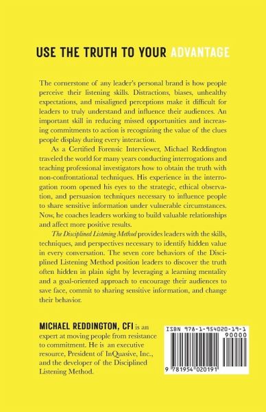 Use the truth to your advantage. The cornerstone of any leader's personal brand is how people perceive their listening skills. Distractions, biases, unhealthy expectations, and misaligned perceptions make it difficult for leaders to truly understand and influence their audiences. An important skill in reducing missed opportunities and increasing commitments to action is recognizing the value of the clues people display during every interaction. As a Certified Forensic Interviewer, Michael Reddington traveled the world for many years conducting interrogations and teaching professional investigators how to obtain the truth with non-confrontational techniques. His experience in the interrogation room opened his eyes to the strategic, ethical observation, and persuasion techniques necessary to influence people to share sensitive information under vulnerable circumstances. Now, he coaches leaders working to build valuable relationships and affect more positive results. The Disciplined Listening Method provides leaders with the skills, techniques, and perspectives necessary to identify hidden value in every conversation. The seven core behaviors of the Disciplined Listening Method position leaders to discover the truth often hidden in plain sight by leveraging a learning mentality and a goal-oriented approach to encourage their audiences to save face, commit to sharing sensitive information, and change their behavior.