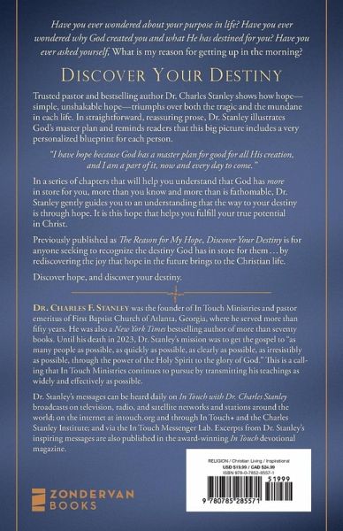 Have you ever wondered about your purpose in life? Have you ever wondered why God created you and what He has destined for you? Have you ever asked yourself, What is my reason for getting up in the morning? Trusted pastor and best-selling author Dr. Charles Stanley shows how hope?simple, unshakable hope?triumphs over both the tragic and the mundane in each life. In straightforward, reassuring prose, Dr. Stanley illustrates God's master plan and reminds readers that this big picture includes a very personalized blueprint for each person. "I have hope because God has a master plan for good for all His creation, and I am a part of it, now and every day to come." In a series of chapters that will help you understand that God has more in store for you, more than you know and more than is fathomable, Dr. Stanley gently guides you to an understanding that the way to your destiny is through hope. It is this hope that helps you fulfill your true potential in Christ. Previously published as The Reason for My Hope, Discover Your Destiny is for anyone seeking to recognize the destiny God has in store for them... by rediscovering the joy that hope in the future brings to the Christian life.