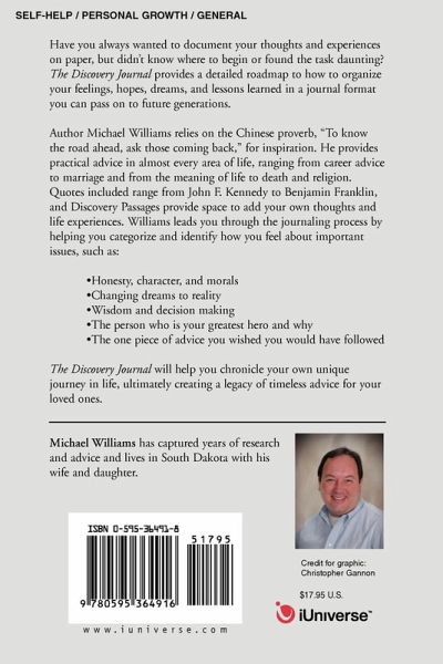 Have you always wanted to document your thoughts and experiences on paper, but didn't know where to begin or found the task daunting? The Discovery Journal provides a detailed roadmap to how to organize your feelings, hopes, dreams, and lessons learned in a journal format you can pass on to future generations. Author Michael Williams relies on the Chinese proverb, 'To know the road ahead, ask those coming back," for inspiration. He provides practical advice in almost every area of life, ranging from career advice to marriage and from the meaning of life to death and religion. Quotes included range from John F. Kennedy to Benjamin Franklin, and Discovery Passages provide space to add your own thoughts and life experiences. Williams leads you through the journaling process by helping you categorize and identify how you feel about important issues, such as: Honesty, character, and morals Changing dreams to reality Wisdom and decision making The person who is your greatest hero and why The one piece of advice you wished you would have followed The Discovery Journal will help you chronicle your own unique journey in life, ultimately creating a legacy of timeless advice for your loved ones.
