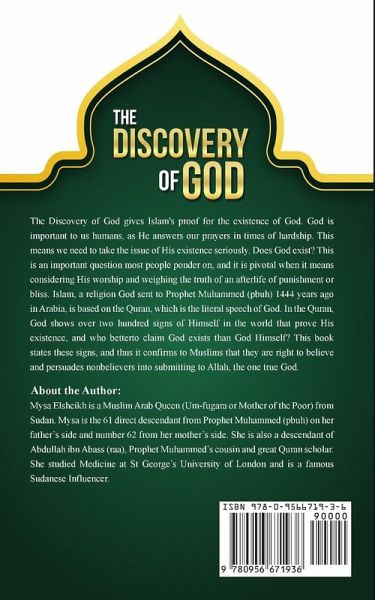 The Discovery of God gives Islam's proof for the existence of God. God is important to us humans, as He answers our prayers in times of hardship. This means we need to take the issue of His existence seriously. Does God exist? This is an important question most people ponder on, and it is pivotal when it means considering His worship and weighing the truth of an afterlife of punishment or bliss. Islam, a religion God sent to Prophet Muhammed (pbuh) 1444 years ago in Arabia, is based on the Quran, which is the literal speech of God. In the Quran, God shows over two hundred signs of Himself in the world that prove His existence, and who better to claim God exists than God Himself? This book states these signs, and thus it confirms to Muslims that they are right to believe and persuades nonbelievers into submitting to Allah, the one true God.