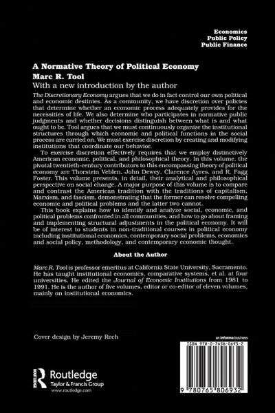 The Discretionary Economy argues that we do in fact control our own political and economic destinies. As a community, we have discretion over policies that determine whether an economic process adequately provides for the necessities of life. We also determine who participates in normative public judgments and whether decisions distinguish between what is and what ought to be. Tool argues that we must continuously organize the institutional structures through which economic and political functions in the social process are carried on. We must exercise discretion by creating and modifying institutions that coordinate our behavior. To exercise discretion effectively requires that we employ distinctively American economic, political, and philosophical theory. In this volume, the pivotal twentieth-century contributors to this encompassing theory of political economy are Thorstein Veblen, John Dewey, Clarence Ayres, and R. Fagg Foster. This volume presents, in detail, their analytical and philosophical perspective on social change. A major purpose of this volume is to compare and contrast the American tradition with the traditions of capitalism, Marxism, and fascism, demonstrating that the former can resolve compelling economic and political problems and the latter two cannot. This book explains how to identify and analyze social, economic, and political problems confronted in all communities, and how to go about framing and implementing structural adjustments in the political economy. It will be of interest to students in non-traditional courses in political economy including institutional economics, contemporary social problems, economics and social policy, methodology, and contemporary economic thought.