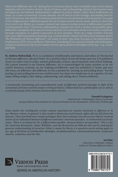 Liberty for Jefferson was 'the' driving force of human history and a realizable state of the human organism and of a society of men. Study of history and anthropology showed that humans were moving from the barbaric independence suffered in primal hordes, which lived inefficiently on lands, to a more economical, human-friendly use of land in social settings, demanding laws for order. Those laws, historically, favored the powerful few to the detriment of the hoi polloi. As a pupil of the Enlightenment, Jefferson argued that all humans were by nature equal, and thus, deserving of as much civic liberty as a reason-oriented and sciences-loving society, a Jeffersonian republic, could guarantee them. This book, philosophical, explains how such a society was possible, given Jefferson's conception of the nature of man, and how the realization of one such society could lead, through contagion, to a global community of such societies. There are a large number of books that cover Jefferson's political ideology (e.g., Gordon Wood's 'Empire of Liberty' and Adrienne Koch's 'The Philosophy of Thomas Jefferson')-too many to limn-but none that gets at the philosophical implications of TJ's views on liberty. This book, examining TJ as a natural scientist and philosophy, examines and situates him in the manner of other great political ideologists of his day-e.g., Hume and Kant.