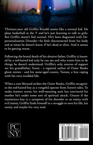 Griffin Rinaldi’s dissociative disorder makes him feel disconnected from his body and mind. After his dad’s death, Griffin is haunted by a red-haired boy only he can see. His sole support is his grandfather, Soren, an author of Outer Banks ghost stories . When a blizzard hits the Outer Banks, Griffin recognizes the boy as a vengeful specter from Soren's tales. Unsure if the boy is part of his disorder or an evil entity, Griffin must struggle to save his life, his sanity and maybe his soul.