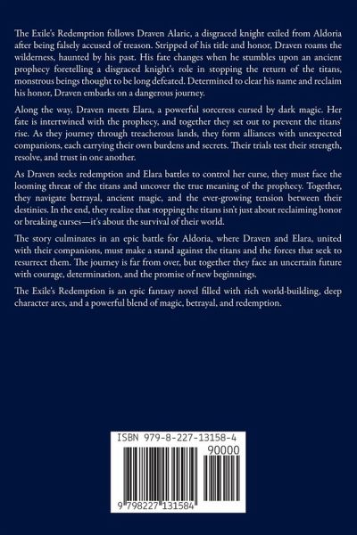The Exile's Redemption follows Draven Alaric, a disgraced knight exiled from Aldoria after being falsely accused of treason. Stripped of his title and honor, Draven roams the wilderness, haunted by his past. His fate changes when he stumbles upon an ancient prophecy foretelling a disgraced knight's role in stopping the return of the titans, monstrous beings thought to be long defeated. Determined to clear his name and reclaim his honor, Draven embarks on a dangerous journey. Along the way, Draven meets Elara, a powerful sorceress cursed by dark magic. Her fate is intertwined with the prophecy, and together they set out to prevent the titans' rise. As they journey through treacherous lands, they form alliances with unexpected companions, each carrying their own burdens and secrets. Their trials test their strength, resolve, and trust in one another. As Draven seeks redemption and Elara battles to control her curse, they must face the looming threat of the titans and uncover the true meaning of the prophecy. Together, they navigate betrayal, ancient magic, and the ever-growing tension between their destinies. In the end, they realize that stopping the titans isn't just about reclaiming honor or breaking curses-it's about the survival of their world. The story culminates in an epic battle for Aldoria, where Draven and Elara, united with their companions, must make a stand against the titans and the forces that seek to resurrect them. The journey is far from over, but together they face an uncertain future with courage, determination, and the promise of new beginnings. The Exile's Redemption is an epic fantasy novel filled with rich world-building, deep character arcs, and a powerful blend of magic, betrayal, and redemption.
