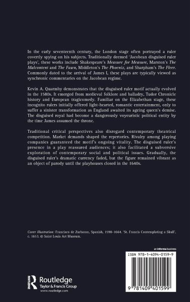 In the early seventeenth century, the London stage often portrayed a ruler covertly spying on his subjects. Traditionally deemed 'Jacobean disguised ruler plays', these works include Shakespeare's Measure for Measure, Marston's The Malcontent and The Fawn, Middleton's The Phoenix, and Sharpham's The Fleer. Commonly dated to the arrival of James I, these plays are typically viewed as synchronic commentaries on the Jacobean regime. Kevin A. Quarmby demonstrates that the disguised ruler motif actually evolved in the 1580s. It emerged from medieval folklore and balladry, Tudor Chronicle history and European tragicomedy. Familiar on the Elizabethan stage, these incognito rulers initially offered light-hearted, romantic entertainment, only to suffer a sinister transformation as England awaited its ageing queen's demise. The disguised royal had become a dangerously voyeuristic political entity by the time James assumed the throne. Traditional critical perspectives also disregard contemporary theatrical competition. Market demands shaped the repertories. Rivalry among playing companies guaranteed the motif's ongoing vitality. The disguised ruler's presence in a play reassured audiences; it also facilitated a subversive exploration of contemporary social and political issues. Gradually, the disguised ruler's dramatic currency faded, but the figure remained vibrant as an object of parody until the playhouses closed in the 1640s.