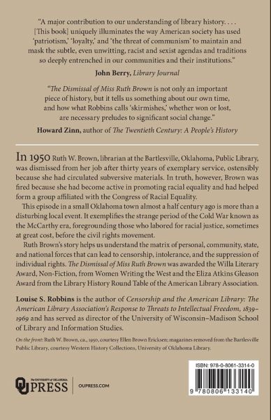 In 1950 Ruth W. Brown, librarian at the Bartlesville, Oklahoma, Public Library, was summarily dismissed from her job after thirty years of exemplary service, ostensibly because she had circulated subversive materials. In truth, however, Brown was fired because she had become active in promoting racial equality and had helped form a group affiliated with the Congress of Racial Equality. Louise S. Robbins tells the story of the political, social, economic, and cultural threads that became interwoven in a particular time and place, creating a strong web of opposition. This combination of forces ensnared Ruth Brown and her colleagues-for the most part women and African Americans-who championed the cause of racial equality. This episode in a small Oklahoma town almost a half-century ago is more than a disturbing local event. It exemplifies the McCarthy era, foregrounding those who labored for racial justice, sometimes at great cost, before the civil rights movement. In addition, it reveals a masking of concerns that led even Brown's allies to obscure the cause of racial integration for which she fought. Relevant today, Ruth Brown's story helps us understand the matrix of personal, community, state, and national forces that can lead to censorship, intolerance, and the suppression of individual rights.