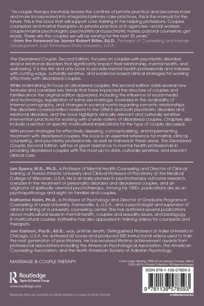 Foreword: The Disordered Couple: Moving Forward James Bitter Introduction: The Changing Landscape of Couple Therapy Today and Tomorrow Katherine Helm and Len Sperry Part I: Treating Disordered Couples Today 1: Issues and Treatment Considerations in Couple Therapy Today Katherine Helm 2: Social Media and the Impact of Technology on Couples and Their Disorders Kimberly Duris 3. Assessment, Diagnosis, and Case Conceptualization with Couples Len Sperry Part II: Disordered Couples 4. The Depressed and Bipolar Couple Chante' D. DeLoach 5. The Psychotic Couple Len Sperry and Michael Maniacci 6. The Anxious Couple Katie Springfield and Rosa M. Macklin-Hinkle 7. The Traumatized Couple Emily Petkus 8. The Borderline Couple George Stoupas 9. The Narcissistic Couple Margo Bristow 10. The Histrionic Obsessive-Compulsive Couple Len Sperry and Michael Maniacci 11. The Eating Disordered Couple Sofie Azmy 12. The Sexually Disordered Couple Shannon Dermer and Molli E. Bachenberg 13. The Alcohol and Drug Addicted Couple Michael Lloyd and Ellen Thursby 14. The Sexually Addicted Couple Emily Petkus and Lisa Brown 15. The Distracted Couple Larry Maucieri 16. The Domestic Violence Couple Lisa Brown Part III: Developmental Issues Impacting Couples 17.The Sandwich Generation: Stage of Life Issues in Couples Kenneth Oliver 18. Religious and Spiritual Issues in Couples Steven J. Sandage, Chance A. Bell, Sarah H.Moon, and Elizabeth G. Ruffing Part IV: Treating Disordered Couples: Retrospective and Prospective 19. The Disordered Couple: Past, Present and Future Len Sperry and Katherine Helm