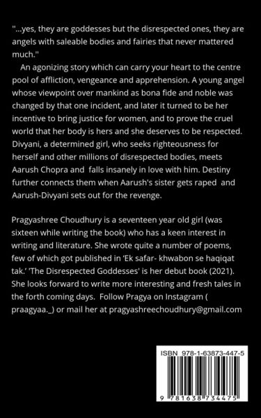 An agonizing story which can carry your heart to the centre pool of affliction,vengeance and apprehension. A young angel whose viewpoint over mankind as bona fide and noble was changed by that one incident, and later it turned to be her incentive to bring justice for women, and to prove to the cruel world that her body is hers,and she deserves to be respected. Divyani, a determined girl who seek righteousness for herself and the millions of other disrespected bodies, meets Aarush Chopra,and fall insanely in love with him. Destiny further connects them when Aarush's little sister gets raped and Aarush-Divyani sets out for their revenge. ""The Disrespected Goddesses "" will never fail in creating the heart-rending visuals in your mind's eye, and will leave you in the fire of the ongoing crimes in the world.