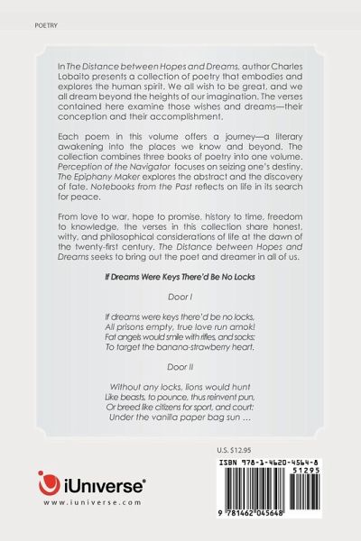 In The Distance between Hopes and Dreams, author Charles Lobaito presents a collection of poetry that embodies and explores the human spirit. We all wish to be great, and we all dream beyond the heights of our imagination. The verses contained here examine those wishes and dreams¿their conception and their accomplishment. Each poem in this volume offers a journey¿a literary awakening into the places we know and beyond. The collection combines three books of poetry into one volume. Perception of the Navigator focuses on seizing one¿s destiny. The Epiphany Maker explores the abstract and the discovery of fate. Notebooks from the Past reflects on life in its search for peace. From love to war, hope to promise, history to time, freedom to knowledge, the verses in this collection share honest, witty, and philosophical considerations of life at the dawn of the twenty-first century. The Distance between Hopes and Dreams seeks to bring out the poet and dreamer in all of us. If Dreams Were Keys There¿d Be No Locks Door I If dreams were keys there¿d be no locks, All prisons empty, true love run amok! Fat angels would smile with rifles, and socks: To target the banana-strawberry heart. Door II Without any locks, lions would hunt Like beasts, to pounce, thus reinvent pun, Or breed like citizens for sport, and court: Under the vanilla paper bag sun ¿