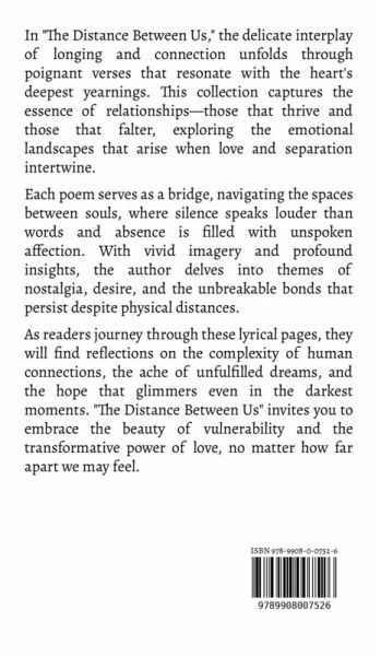 In "The Distance Between Us," the delicate interplay of longing and connection unfolds through poignant verses that resonate with the heart's deepest yearnings. This collection captures the essence of relationships-those that thrive and those that falter, exploring the emotional landscapes that arise when love and separation intertwine. Each poem serves as a bridge, navigating the spaces between souls, where silence speaks louder than words and absence is filled with unspoken affection. With vivid imagery and profound insights, the author delves into themes of nostalgia, desire, and the unbreakable bonds that persist despite physical distances. As readers journey through these lyrical pages, they will find reflections on the complexity of human connections, the ache of unfulfilled dreams, and the hope that glimmers even in the darkest moments. "The Distance Between Us" invites you to embrace the beauty of vulnerability and the transformative power of love, no matter how far apart we may feel.