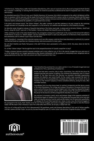 " In his first novel, Finding Marco, author Ken Cancellara describes how, after years of corporate activity, the novel's protagonist (Mark Gentile) has a personal "awakening" in realizing that his ambition for material success has overshadowed his need for happiness and a life of ethics and morality. Sun-drenched memories of life as it once was in Gentile's hometown of Acerenza, Italy (which corresponds to the author's birthplace) call him back to reconnect with his roots and with the simple life he had left behind some half a century earlier. In Acerenza, Gentile took the lessons given to him, as a child, by his grandfather and succeeds in finding a balance between material ambition and more reflective ethics. After long reflection Gentile contemplates the possibility of a permanent move to Italy. In his poetic and eloquent sequel "The Distant Whisper", the author continues to quell the turbulence in his soul, caused by the continuing struggle between two competing forces: the compulsion of a life driven by raw ambition and the need for a life framed by morality. He takes the reader through an odyssey of beautiful descriptions of the Italian countryside in places such as Sorrento, Positano, Amalfi and Ravello along the Amalfi coast and of the Southern Italians who inhabit that beautiful corner of the world. While continuing to bask in this indescribable beauty, the protagonist is being slowly pulled back to the corporate life he had left behind in North America. It was as if a "distant whisper" was now summoning him back to wipe away the greed of its Chairman of the corporation he had abandoned, and to attempt to pull it back from the brink. Author Cancellara's recounting of the corporate manoeuvres to save the company could only have been described so realistically by a person who had had hands-on experience as a business attorney and as an executive for many years. But will Mark Gentile's soul finally find peace in the end? Will he return permanently to his place a birth-the place where he had his epiphany? Or will that "distant whisper" that brought him back to his adopted homeland of Canada compel him to stay? "Finding a balance between societally-imposed ambitions and a more reflective way of life is the internal struggle that more and more of us will be facing both by our younger generations as they become disillusioned with the pressures of maintaining career obligations and our aging populations as they enter the more mature and reflective periods in their lives. "