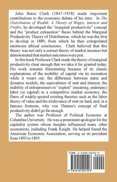 John Bates Clark (1847-1938) made important contributions to the economic debate of his time. In The Distribution of Wealth: A Theory of Wages, Interest and Profits, he developed the "marginal productivity" concept and the "product exhaustion" thesis behind the Marginal Productivity Theory of Distribution, which he was the first to develop in 1889, from which he then extrapolated enormous ethical conclusions. Clark believed that this theory was not only a correct theory of market incomes but demonstrated that market outcomes were just. In this book Professor Clark made the theory of marginal productivity clear enough that we take it for granted today. His work remains illuminating because of its classic explanations of the mobility of capital via its recreation while it wears out, the difference between static and dynamic models, the equivalence of rent and interest, the inability of entrepreneurs to "exploit" (meaning, underpay) labor (or capital) in a competitive market economy, the flaws of widely-quoted existing theories such as the labor theory of value and the irrelevance of rent on land, and, in a famous footnote, why von Thünen's concept of final productivity didn't go far enough. The author was Professor of Political Economy at Columbia University. He was a prominent apologist for the capitalist system whose insights influenced many other economists, including Frank Knight. He helped found the American Economic Association, serving as its president from 1893 to 1895.