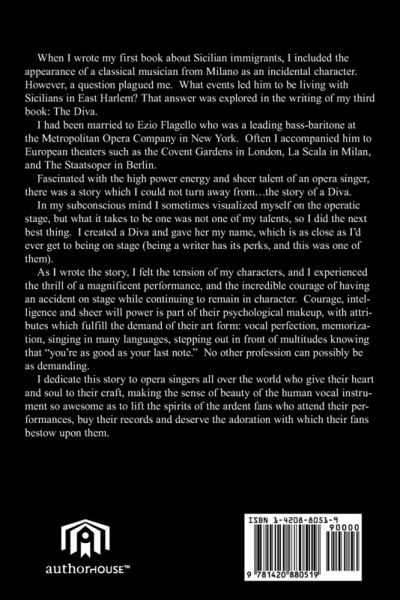 When I wrote my first book about Sicilian immigrants, I included the appearance of a classical musician from Milano as an incidental character. However, a question plagued me. What events led him to be living with Sicilians in East Harlem? That answer was explored in the writing of my third book: The Diva. I had been married to Ezio Flagello who was a leading bass-baritone at the Metropolitan Opera Company in New York. Often I accompanied him to European theaters such as the Covent Gardens in London, La Scala in Milan, and The Staatsoper in Berlin. Fascinated with the high power energy and sheer talent of an opera singer, there was a story which I could not turn away from.the story of a Diva. In my subconscious mind I sometimes visualized myself on the operatic stage, but what it takes to be one was not one of my talents, so I did the next best thing. I created a Diva and gave her my name, which is as close as I''d ever get to being on stage (being a writer has its perks, and this was one of them). As I wrote the story, I felt the tension of my characters, and I experienced the thrill of a magnificent performance, and the incredible courage of having an accident on stage while continuing to remain in character. Courage, intelligence and sheer will power is part of their psychological makeup, with attributes which fulfill the demand of their art form: vocal perfection, memorization, singing in many languages, stepping out in front of multitudes knowing that "you''re as good as your last note." No other profession can possibly be as demanding. I dedicate this story to opera singers all over the world who give their heart and soul to their craft, making the sense of beauty of the human vocal instrument so awesome as to lift the spirits of the ardent fans who attend their performances, buy their records and deserve the adoration with which their fans bestow upon them.