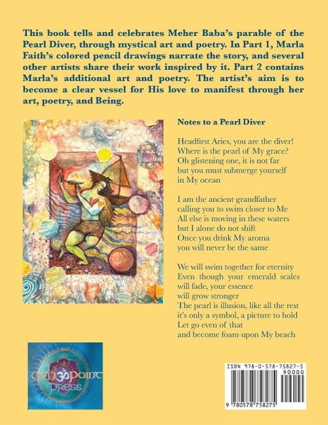 The Diver and the Pearl; story by Meher Baba, art and poetry by Marla Faith and guests. A short parable by Hafiz is retold by Meher Baba, and then illustrated with colored pencil drawings by Marla Faith. Several other artists have also contributed their work in this section: Mindy Tiberi, Joe DiSabatino, Tom Riley, Jean Vigodsky, Ingka Hella Charters, and Michael Childs. The next half of the book contains Marla's art (paintings, drawings, collages) of Meher Baba in realistic and imaginary styles, as well as her poetry about Meher Baba. This is an uplifting book of beautiful images and mystical poetry and story. Please note that this book is 'Print on Demand,' so if it says 'out of stock,' go ahead and order it and it will be printed.