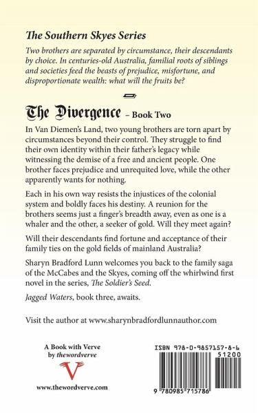 SOUTHERN SKYES SERIES Sharyn Bradford Lunn's landmark saga of adventure and romance spans almost 200 years of family history set against a backdrop of the rich and rugged wilds of Australia. BOOK 2, THE DIVERGENCE The Divergence captures the wide range of relationships between colonists, convicts, hunters, and the indigenous population during the tumultuous events that defined the early penal colonies of Australia and the discovery of gold. The two young sons of Nicholas Thomas, a soldier in the New South Wales Corps, have been torn apart by circumstances beyond their control and struggle to find their own identity within their father's legacy. One son faces the beast of prejudice and unrequited love, while the other is handed everything on a platter . . . or is he? While pioneering new settlements and enterprises, each son, in his own way, resists the injustices of colonial Van Diemen's Land and witnesses the demise of a free and ancient people even as they face their individual misfortunes. Will the sons be reunited . . . and will their descendants find fortune and accept their family ties on the gold fields of mainland Australia? The Divergence reveals another poignant historical adventure in the family saga that is the Southern Skyes series.