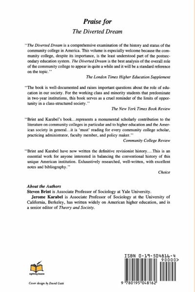 In the twentieth century, Americans have increasingly looked to the schools--and, in particular, to the nation's colleges and universities--as guardians of the cherished national ideal of equality of opportunity. With the best jobs increasingly monopolized by those with higher education, the opportunity to attend college has become an integral part of the American dream of upward mobility. The two-year college--which now enrolls more than four million students in over 900 institutions--is a central expression of this dream, and its invention at the turn of the century constituted one of the great innovations in the history of American education. By offering students of limited means the opportunity to start higher education at home and to later transfer to a four-year institution, the two-year school provided a major new pathway to a college diploma--and to the nation's growing professional and managerial classes. But in the past two decades, the community college has undergone a profound change, shifting its emphasis from liberal-arts transfer courses to terminal vocational programs. Drawing on developments nationwide as well as in the specific case of Massachusetts, Steven Brint and Jerome Karabel offer a history of community colleges in America, explaining why this shift has occurred after years of student resistance and examining its implications for upward mobility. As the authors argue in this exhaustively researched and pioneering study, the junior college has always faced the contradictory task of extending a college education to the hitherto excluded, while diverting the majority of them from the nation's four-year colleges and universities. Very early on, two-year college administrators perceived vocational training for "semi-professional" work as their and their students' most secure long-term niche in the educational hierarchy. With two thirds of all community college students enrolled in vocational programs, the authors contend that the dream of education as a route to upward mobility, as well as the ideal of equal educational opportunity for all, are seriously threatened. With the growing public debate about the state of American higher education and with more than half of all first-time degree-credit students now enrolled in community colleges, a full-scale, historically grounded examination of their place in American life is long overdue. This landmark study provides such an examination, and in so doing, casts critical light on what is distinctive not only about American education, but American society itself.