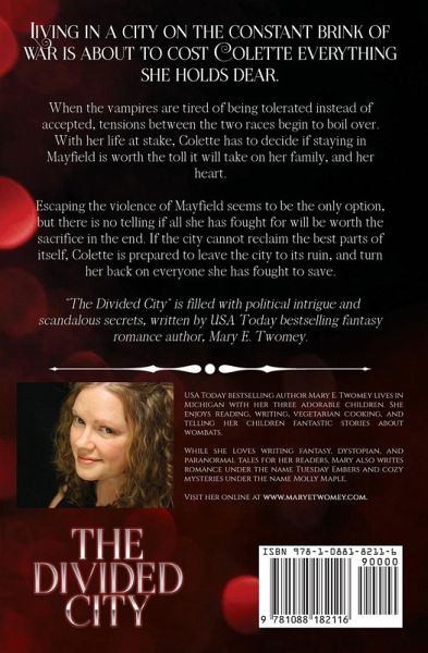 Living in a city on the constant brink of war is about to cost Colette everything she holds dear. When the vampires are tired of being tolerated instead of accepted, tensions between the two races begin to boil over. With her life at stake, Colette has to decide if staying in Mayfield is worth the toll it will take on her family, and her heart. Escaping the violence of Mayfield seems to be the only option, but there is no telling if all she has fought for will be worth the sacrifice in the end. If the city cannot reclaim the best parts of itself, Colette is prepared to leave the city to its ruin, and turn her back on everyone she has fought to save. "The Divided City" is filled with political intrigue and scandalous secrets, written by USA Today bestselling fantasy romance author, Mary E. Twomey.