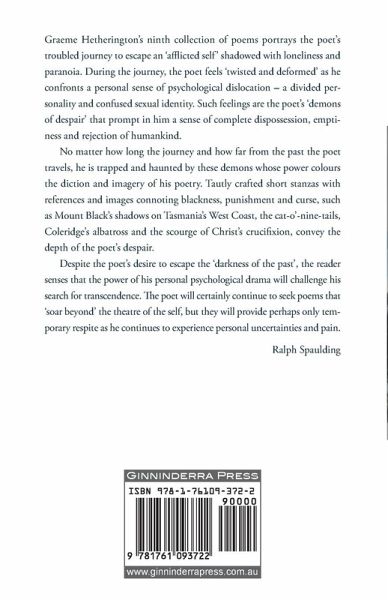 'Graeme Hetherington's ninth collection of poems portrays the poet's troubled journey to escape an 'afflicted self' shadowed with loneliness and paranoia. During the journey, the poet feels 'twisted and deformed' as he confronts a personal sense of psychological dislocation - a divided personality and confused sexual identity. Such feelings are the poet's 'demons of despair' that prompt in him a sense of complete dispossession, emptiness and rejection of humankind. No matter how long the journey and how far from the past the poet travels, he is trapped and haunted by these demons whose power colours the diction and imagery of his poetry. Tautly crafted short stanzas with references and images connoting blackness, punishment and curse, such as Mount Black's shadows on Tasmania's West Coast, the cat-o'-nine-tails, Coleridge's albatross and the scourge of Christ's crucifixion, convey the depth of the poet's despair. Despite the poet's desire to escape the 'darkness of the past', the reader senses that the power of his personal psychological drama will challenge his search for transcendence. The poet will certainly continue to seek poems that 'soar beyond' the theatre of the self, but they will provide perhaps only temporary respite as he continues to experience personal uncertainties and pain.' - Ralph Spaulding