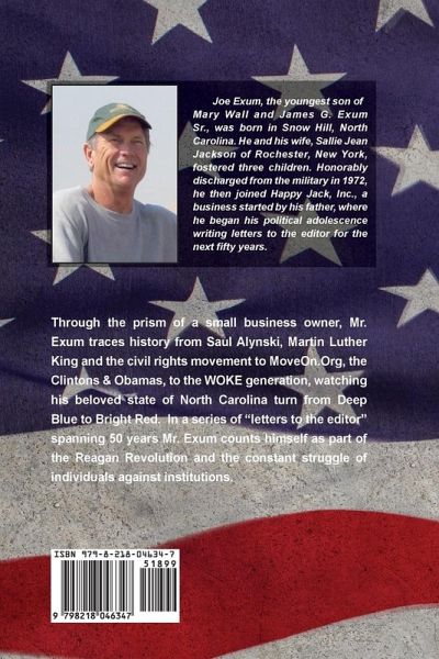 Through the prism of a small business owner, Mr. Exum traces history from Saul Alinsky, Martin Luther King, Jr., and the civil rights movement to MoveOn.Org, the Clintons & Obamas, to the WOKE generation, watching his beloved state of North Carolina turn from Bright Red to Deep Blue. In a series of "letters to the editor" spanning 50 years. Mr. Exum counts himself as part of the Reagan Revolution and the constant struggle of individuals against institutions.
