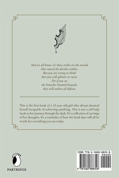 This is the first book of a 16 year old girl who always deemed herself incapable of achieving anything. This is not a self help book or her journey through the dark. It's a collection of carvings of her thoughts. It's a reminder of how the lurid days will all be worth for everything you are today.