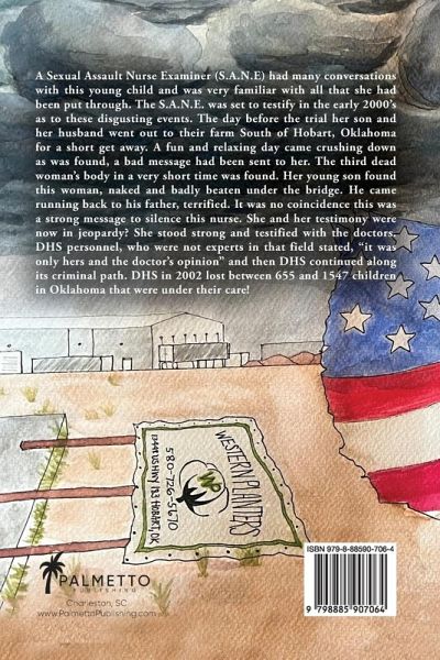 A Sexual Assault Nurse Examiner (S.A.N.E) had many conversations with this young child and was very familiar with all that she had been put through. The S.A.N.E. was set to testify in the early 2000's as to these disgusting events. The day before the trial her son and her husband went out to their farm South of Hobart, Oklahoma for a short get away. A fun and relaxing day came crushing down as was found, a bad message had been sent to her. The third dead woman's body in a very short time was found. Her young son found this woman, naked and badly beaten under the bridge. He came running back to his father, terrified. It was no coincidence this was a strong message to silence this nurse. She and her testimony were now in jeopardy? She stood strong and testified with the doctors. DHS personnel, who were not experts in that field stated, "it was only hers and the doctor's opinion" and then DHS continued along its criminal path. DHS in 2002 lost between 655 and 1547 children in Oklahoma that were under their care!