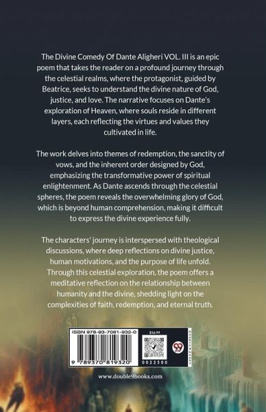 The Divine Comedy Of Dante Aligheri VOL. III is an epic poem that takes the reader on a profound journey through the celestial realms, where the protagonist, guided by Beatrice, seeks to understand the divine nature of God, justice, and love. The narrative focuses on Dante s exploration of Heaven, where souls reside in different layers, each reflecting the virtues and values they cultivated in life. The work delves into themes of redemption, the sanctity of vows, and the inherent order designed by God, emphasizing the transformative power of spiritual enlightenment. As Dante ascends through the celestial spheres, the poem reveals the overwhelming glory of God, which is beyond human comprehension, making it difficult to express the divine experience fully. The characters' journey is interspersed with theological discussions, where deep reflections on divine justice, human motivations, and the purpose of life unfold. Through this celestial exploration, the poem offers a meditative reflection on the relationship between humanity and the divine, shedding light on the complexities of faith, redemption, and eternal truth.