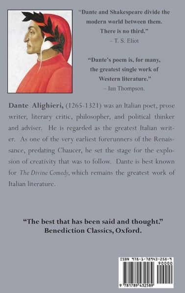 "Dante and Shakespeare divide the modern world between them. There is no third." - T. S. Eliot "Dante's poem is, for many, the greatest single work of Western literature." - Ian Thompson. "I love my Dante as much as the Bible. He is my spiritual food, the rest is ballast." - James Joyce. In the middle of our life's journey, I found myself in a dark wood/Bewildered, and I knew I had lost the way: so opens Dante's Divine Comedy, "the best book literature has achieved" as Jorge Luis Borges writes. The poem, a journey through hell, purgatory, and paradise, "the most original and audacious treatment of the afterlife in Western literature" dazzles with its vivid and inventive storytelling and imagery. However, it contains much more than poetry and theology; it displays Dante's wide and comprehensive learning, and his deep understanding of contemporary politics and society. "All life is contained in the poem, for Dante's was an all-encompassing imagination, that interwove classical philosophy with Catholic doctrine and contemporary politics," (Ian Thompson). The one hundred cantos of The Divine Comedy--Inferno, Purgatorio, and Paradiso--follow Dante, as, guided by the epic poet, Virgil, he travels through the nine descending circles of a freezing Hell, until he meets Satan trapped at the bottom. Clambering over Satan himself, Dante climbs Mount Purgatorio where he is reunited with his lost love Beatrice, whom he had fallen in love with when they were both nine years old. Now guided by Beatrice, who represents divine revelation, he ascends to Paradiso, a world beyond space and time. The Divine Comedy was written over a period of twenty years towards the end of Dante's life. It was appreciated as a masterpiece soon after its completion, and it has captivated readers and the Western imagination ever since. The Inferno is the most widely translated book after the Bible. This edition is translated by the celebrated poet, Henry Wadsworth Longfellow. ¿Dante Alighieri, (1265-1321) was an Italian poet, prose writer, literary critic, philosopher, and political thinker and adviser. He is regarded as the greatest Italian writer. As one of the very earliest forerunners of the Renaissance, predating Chaucer, he set the stage for the explosion of creativity that was to follow. Dante is best known for The Divine Comedy, which remains the greatest work of Italian literature.