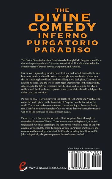 The Divine Comedy describes Dante's travels through Hell, Purgatory, and Paradise and represents the soul's journey towards God. This edition includes the complete texts of Dante's Inferno, Purgatoria, and Paradiso. Inferno - Inferno begins with Dante lost in a dark wood, assailed by beasts he cannot evade, and unable to find the straight way to salvation. Conscious that he is ruining himself and that he is falling into a dark place, Dante is at last rescued by Virgil, and the two of them begin their journey to the underworld. Allegorically, the Inferno represents the Christian soul seeing sin for what it really is, and the three beasts represent three types of sin: the self-indulgent, the violent, and the malicious. Purgatoria - Having survived the depths of Hell, Dante and Virgil ascend out of the undergloom to the Mountain of Purgatory on the far side of the world. The mountain has seven terraces, corresponding to the seven deadly sins. Dante's illustrative examples of sin and virtue draw on classical sources as well as on the Bible and on contemporary events. Paradiso - After an initial ascension, Beatrice guides Dante through the nine celestial spheres of Heaven. These are concentric and spherical, as in Aristotelian and Ptolemaic cosmology. The structure of Paradiso is based on the four cardinal virtues and the three theological virtues. In Paradiso, Dante meets and converses with several great saints of the Church, including Saint Peter, and St. John. Allegorically, the poem represents the soul's ascent to God.