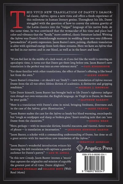 This vivid new translation of Dante's immortal classic, Inferno, opens a new vista and offers a fresh experience of this milestone in human literary genius. Throughout his life, Dante struggled with the question of how to convey the solemn gravity of the Latin classics into the "vulgar" language of his native Italy. At the same time, he was convinced that the vernacular of his time and place had color and vibrancy that the "heady," more cerebral, classic literature lacked. Writing the Inferno was Dante's breakthrough moment in wedding these two very different "personalities" of poetic expression. Jason Baxter's new, pulsing, rhythmic translation is alive with spiritual energy from both these streams. Here we have an Inferno that we feel in our nerves and in our blood, as well as in the heart and head.