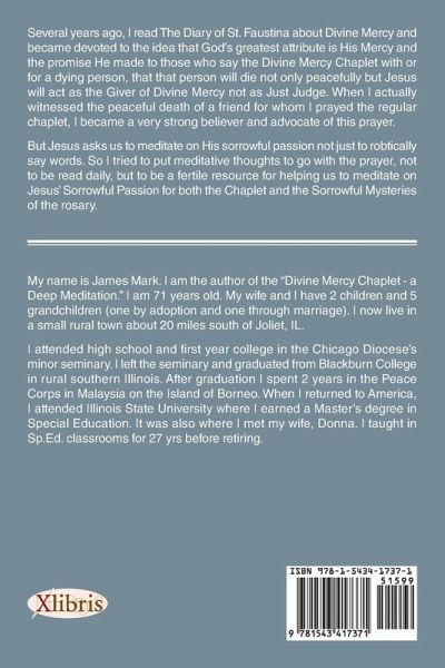 Several years ago, I read the diary of St. Faustina about divine mercy and became devoted to the idea that God?s greatest attribute is his mercy and the promise he made to those who say the Divine Mercy Chaplet with or for a dying person that that person will die not only peacefully but also that Jesus will act as the giver of divine mercy, not as just judge. When I actually witnessed the peaceful death of a friend for whom I prayed the regular chaplet, I became a very strong believer and advocate of this prayer. But Jesus asks us to meditate on his sorrowful passion, not just to robotically say words. So I tried to put meditative thoughts to go with the prayer, not to be read daily but to be a fertile resource for helping us to meditate on Jesus? sorrowful passion for both the chaplet and the sorrowful mysteries of the rosary.
