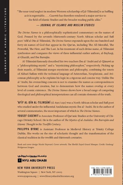 The Divine Names is a philosophically sophisticated commentary on the names of God. Penned by the seventh-/thirteenth-century North African scholar and Sufi poet ?Af?f al-D?n al-Tilims?n?, The Divine Names expounds upon the one hundred and forty-six names of God that appear in the Qur?an.