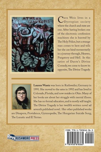 Cara Weis lives in a Dystopian society where the church and state are one. After having broken one of the electronic confession machines she is hunted by The Holy Police, but a strange man comes to here and tells her she can hind momentarily in a journey through, Heaven, Purgatory and Hell. In this satire of Dante's Divine Comedy, we come to know its opposite, The Divine Tragedy.