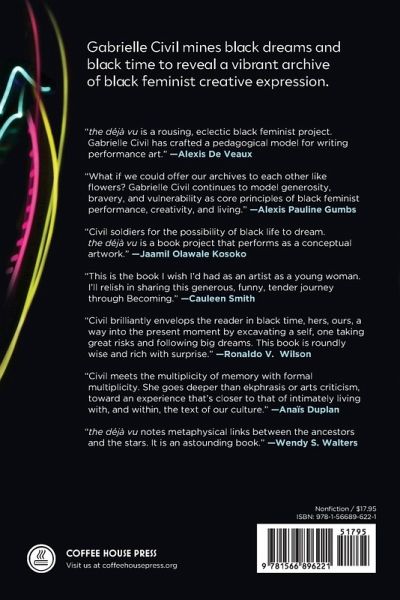 "Gabrielle Civil mines black dreams and black time to reveal a vibrant archive of black feminist creative expressions. Emerging from the intersection of pandemic and uprising, the dâejáa vu activates forms both new and ancestral, drawing movement, speech, and lyric essay into performance memoir. As Civil considers Haitian tourist paintings, dance rituals, race at the movies, black feminist legacies, and more, she reflects on her personal losses and desires, speculates on black time, and dreams into expansive black life. With intimacy, humor, and verve, the dâejáa vu blurs boundaries between memory, grief, and love; then, now, and the future"--