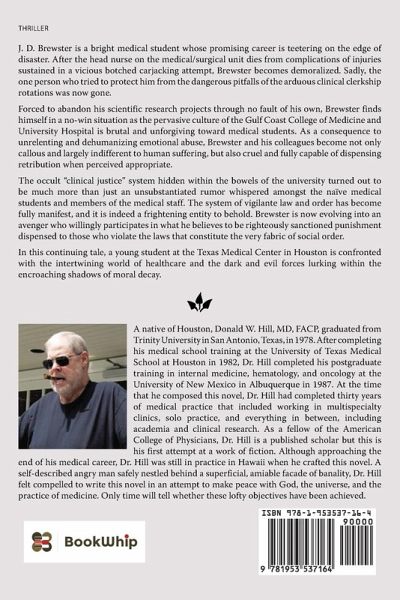 J. D. Brewster is a bright medical student whose promising career is teetering on the edge of disaster. After the head nurse on the medical/surgical unit dies from complications of injuries sustained in a vicious botched carjacking attempt, Brewster becomes demoralized. Sadly, the one person who tried to protect him from the dangerous pitfalls of the arduous clinical clerkship rotations was now gone. Forced to abandon his scientific research projects through no fault of his own, Brewster finds himself in a no-win situation as the pervasive culture of the Gulf Coast College of Medicine and University Hospital is brutal and unforgiving toward medical students. As a consequence to unrelenting and dehumanizing emotional abuse, Brewster and his colleagues become not only callous and largely indifferent to human suffering, but also cruel and fully capable of dispensing retribution when perceived appropriate. The occult "clinical justice" system hidden within the bowels of the university turned out to be much more than just an unsubstantiated rumor whispered amongst the naïve medical students and members of the medical staff. The system of vigilante law and order has become fully manifest, and it is indeed a frightening entity to behold. Brewster is now evolving into an avenger who willingly participates in what he believes to be righteously sanctioned punishment dispensed to those who violate the laws that constitute the very fabric of social order. In this continuing tale, a young student at the Texas Medical Center in Houston is confronted with the intertwining world of healthcare and the dark and evil forces lurking within the encroaching shadows of moral decay.