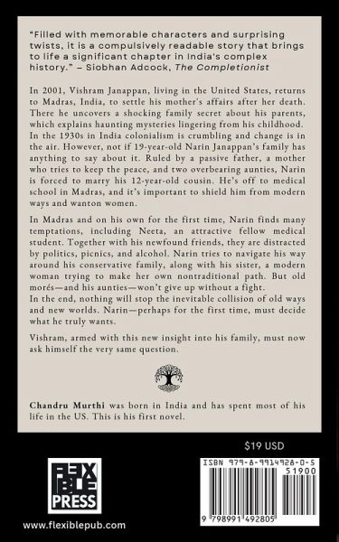 In 2001 Vishram Janappan, living in San Francisco, returns to Madras, India, to settle his mother's affairs after her death. On the surface Vishram's life couldn't be going better. He's a successful architect in San Francisco with a beautiful home and married to a loving wife. But somehow, something is missing. In Madras he doesn't know the customs and barely understands the language. As he goes through his mother's belongings, he uncovers a shocking family secret, which explains haunting mysteries lingering from his childhood. In the 1930s and 40s in India colonialism is crumbling and change is in the air. However, not if Narin Janappan's family has anything to say about it. Ruled by a passive father, a mother who tries to keep the peace, and two overbearing aunts, the family name is everything. Narin has learned in his short life to be quiet and toe the line. Now 19, he is to marry a 12-year-old cousin not of his choosing so that when he goes off to medical school in Madras, he won't be tempted by modern ways and wanton women. That was the plan. On his own for the first time, Narin tries. He wants to be a good son, but he's far from home and is exposed to new ways and many temptations. He befriends fellow students Laxman, a rebellious free thinker, and Ambika, Laxman's girlfriend. Together they are distracted by politics, picnics, and alcohol. Ambika introduces Narin to her friend and fellow student Neeta. They hit it off. Narin didn't know he could feel like this; he can't get Neeta out of his mind. Meanwhile, his sister, Sheela, a modern woman herself, trying to make her own nontraditional path, moves to Madras as well. Together, despite the dangers, they delight in their newfound freedoms. However, the old world has eyes, and the family of his young bride soon find out about Narin's lack of discretion, resulting in recrimination and conflict. The old ways-and his aunties-won't give up without a fight. In the end, Narin has to forge his own path around his conservative family and ask himself-perhaps for the first time in his life- what does he truly want? Vishram, armed with this new insight into his family, must now ask himself the very same question.