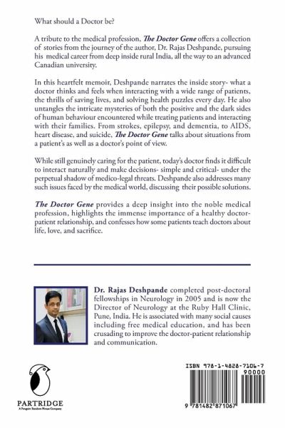 What should a Doctor be? A tribute to the medical profession, The Doctor Gene offers a collection of stories from the journey of the author, Dr. Rajas Deshpande, pursuing his medical career from deep inside rural India, all the way to an advanced Canadian university. In this heartfelt memoir, Deshpande narrates the inside story- what a doctor thinks and feels when interacting with a wide range of patients, the thrills of saving lives, and solving health puzzles every day. He also untangles the intricate mysteries of both the positive and the dark sides of human behaviour encountered while treating patients and interacting with their families. From strokes, epilepsy, and dementia, to AIDS, heart disease, and suicide, The Doctor Gene talks about situations from a patient's as well as a doctor's point of view. While still genuinely caring for the patient, today's doctor ¿nds it di¿cult to interact naturally and make decisions- simple and critical- under the perpetual shadow of medico-legal threats. Deshpande also addresses many such issues faced by the medical world, discussing their possible solutions. The Doctor Gene provides a deep insight into the noble medical profession, highlights the immense importance of a healthy doctor-patient relationship, and confesses how some patients teach doctors about life, love, and sacri¿ce.