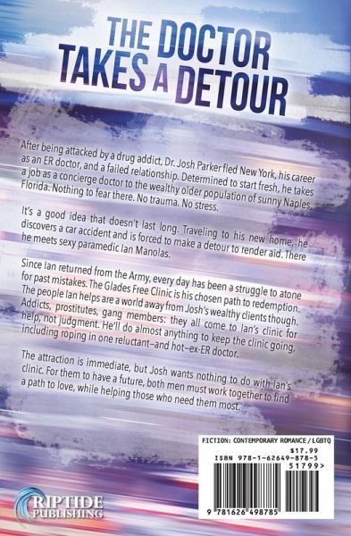 After being attacked by a drug addict, Dr. Josh Parker fled New York, his career as an ER doctor, and a failed relationship. Determined to start fresh, he takes a job as a concierge doctor to the wealthy older population of sunny Naples, Florida. Nothing to fear there. No trauma. No stress. It’s a good idea that doesn’t last long. Traveling to his new home, he discovers a car accident and is forced to make a detour to render aid. There he meets sexy paramedic Ian Manolas. Since Ian returned from the Army, every day has been a struggle to atone for past mistakes. The Glades Free Clinic is his chosen path to redemption. The people Ian helps are a world away from Josh’s wealthy clients though. Addicts, prostitutes, gang members: they all come to Ian’s clinic for help, not judgment. He’ll do almost anything to keep the clinic going, including roping in one reluctant—and hot—ex-ER doctor. The attraction is immediate, but Josh wants nothing to do with Ian’s clinic. For them to have a future, both men must work together to find a path to love, while helping those who need them most.