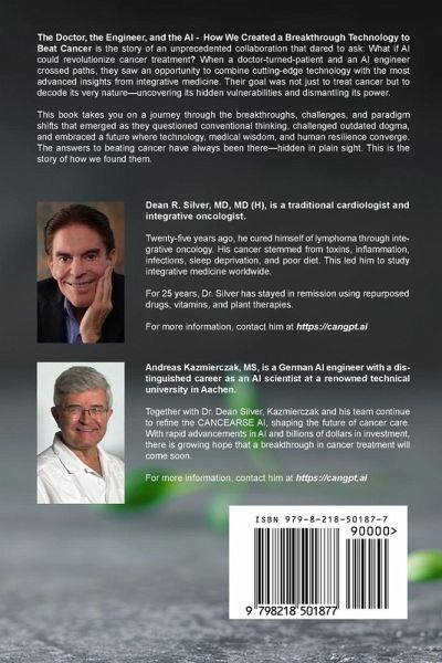 "The Doctor, the Engineer, and the AI: How We Created a Breakthrough Technology to Beat Cancer" is a transformative guide that challenges conventional cancer treatment paradigms. Co-authored by Dean Silver, MD, MD (H), and Andreas Kazmierczak, MS, this book introduces an innovative fusion of cutting-edge artificial intelligence with holistic, integrative medicine, offering a revolutionary approach to cancer care. The authors, drawing from both personal experiences and professional expertise, provide a unique dual perspective-one from a physician with deep roots in integrative medicine, and the other from an AI engineer who has leveraged technology to tackle cancer in groundbreaking ways. Together, they present a comprehensive exploration of cancer treatments that go beyond standard protocols, including nutritional strategies, herbal medicine, mind-body techniques, and advanced AI-driven diagnostics. At the heart of this book lies CANCERASE GPT, an AI-powered tool designed to tailor treatment plans to each patient's specific needs. By integrating machine learning algorithms with a deep understanding of integrative oncology, CANCERASE GPT represents the future of personalized medicine, helping to make complex data actionable and accessible to both patients and healthcare providers. Through case studies, personal stories, and expert insights, the book not only offers a wealth of practical advice for navigating cancer treatment but also provides a holistic framework that empowers patients. Emphasizing the emotional, psychological, and spiritual aspects of cancer, it calls for a collaborative approach to healing, where patients take an active role in shaping their journey. Whether you are a patient, a caregiver, or a healthcare professional, "The Doctor, the Engineer, and the AI" is more than just a treatment manual-it is a beacon of hope. It showcases the transformative potential of combining human expertise with artificial intelligence to create a future of cancer care that is not only more effective but also more compassionate. This groundbreaking work will inspire you to think differently about cancer, explore all treatment possibilities, and embrace the powerful synergy of integrated, AI-enhanced medicine.