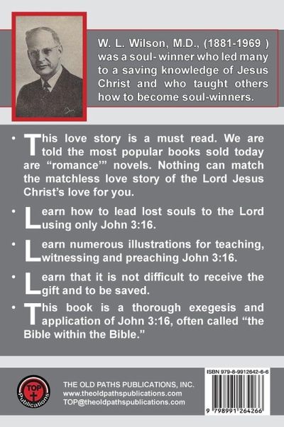 Dr. Wilson (1881-1969) was a colleague of mine who destroys the "easy believism" popular during my lifetime. Yet, he presents the fact that to be saved is NOT difficult but is absolutely dependent upon a personal faith in the Lord Jesus Christ, Who loved you with an eternal love. Reading the book will fill your heart with great joy.This easy to read, matchless "love story" will inspire you beyond measure because it assures you, encourages you, and affirms GOD'S ETERNAL GIFT:This love story, "The Doctor's Best Love Story," is a must read. We are told the most popular books sold today are "romance'" novels. Nothing can match the matchless love story of the Lord Jesus Christ's love for you. Learn how to lead lost souls to the Lord using only John 3:16. Learn numerous illustrations for teaching, witnessing and preaching John 3:16. Learn that it is not difficult to receive the gift and to be saved. This book is a thorough exegesis and application of John 3:16, often called "the Bible within the Bible."