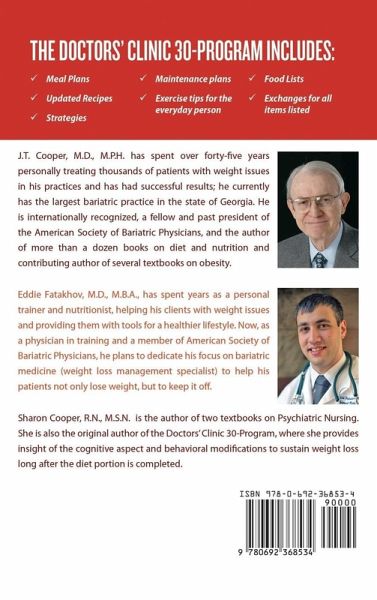 The Doctors' Clinic-30 Program is based on sound principles, research, and, testimonials from previous patients. This is a practical way to eat healthy and lose weight. Instead of providing another diet plan, this program is based on change and lifestyle modification. It follows the food group principles and portion control. This program will provide you all the tools you need to lose weight and keep it off without having to keep a diary, purchase an expensive gym membership, or even spend a lot of money at the grocery store.