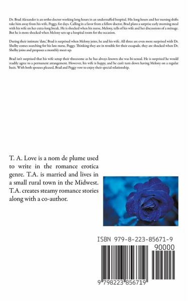 Dr. Brad Alexander is an ortho doctor working long hours in an understaffed hospital. His long hours and her nursing shifts take him away from his wife, Peggy, for days. Calling in a favor from a fellow doctor, Brad plans a surprise early morning meal with his wife on her extra-long break. He is shocked when his nurse, Melony, tells of his wife and her discussions of a ménage. But he is more shocked when Melony sets up a hospital room for the occasion. During their intimate 'date,' Brad is surprised when Melony joins, he and his wife. All three are even more surprised with Dr. Shelby comes searching for his late nurse, Peggy. Thinking they are in trouble for their escapade, they are shocked when Dr. Shelby joins and proposes a monthly meet-up. Brad isn't surprised that his wife setup their threesome as he has always known she was bi-sexual. He is surprised he would readily agree to a permanent arrangement. However, his wife is happy, and he can't turn down having Melony on a regular basis. With both spouses pleased, Brad and Peggy vow to enjoy their special relationship.